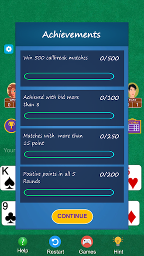 Callbreak is played with a standard deck of 52 cards among 4 players. After each deal player has to make a "Call" or "bid" for the number of hands he/she can capture, and the objective is to capture at least that many hands in the round, and try to break other player i.e. stop them from getting their Call. After each round, points will be calculated and after five rounds of play each players five rounds points will be added as a total points and player with highest total point will win.