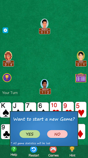 There will be five rounds of play or five deals in a game. First dealer will be chosen randomly and after that, the turn to deal rotates clockwise from first dealer. Dealer will deal all 52 cards to four players i.e. 13 each. After the completion of each deal, player left to dealer will make a Call - which is a number of hands( or tricks) he/she thinks will probably going to capture, and call moves again in clockwise to next player until all 4 players finished calling.