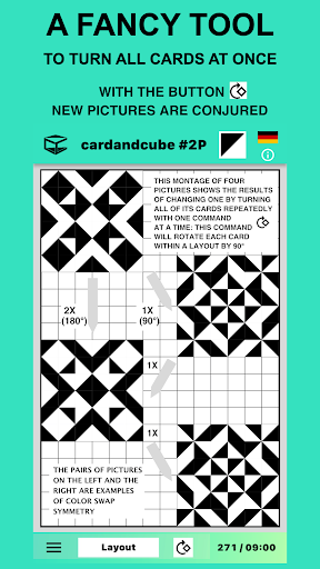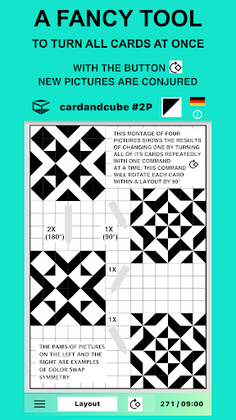 On the lower bar there is a function for simultaneously rotating all cards by 90° individually. By repeatedly activating this button, three other images can be created from one you began with. After the fourth press of the button, the original image is restored.