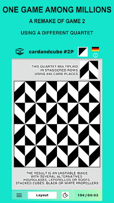 Four cards can be used to create 256 different patterns called quartets. One of many ways to fill the layout is to simply repeat a group of cards such as a quartet or a combination of several quartets, over the entire play area. Differently oriented cards meet at the edges of neighboring quartets, which leads to an enlargement of the black or white areas or an area of contrast.