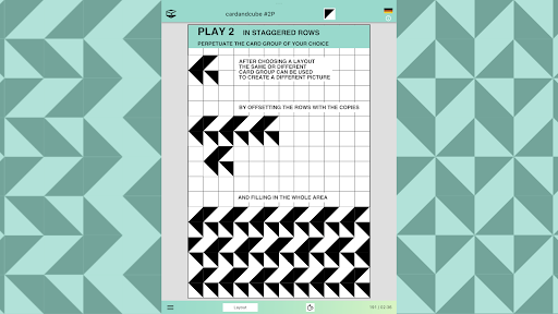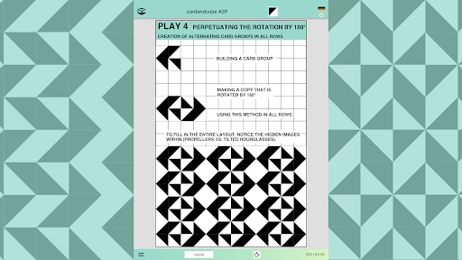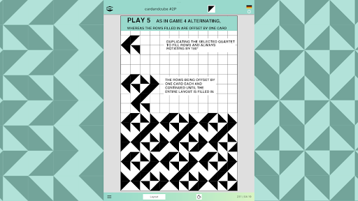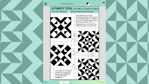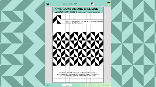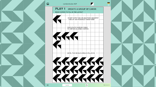 In cooperative and competitive games, players can distribute a card2 file with a portion of the layout filled with cards along with suggestions for the next steps such as horizontal or vertical mirroring, mirroring with color swapping or making copies to create a larger image with a four-fold rotational symmetry that result in complete filling of the layout. The players send back the resulting files. If they want to compete, they can compare scores (see next paragraph).