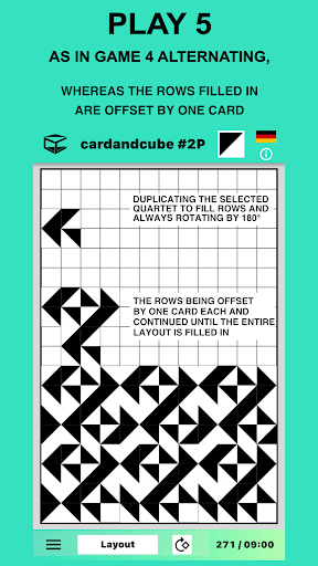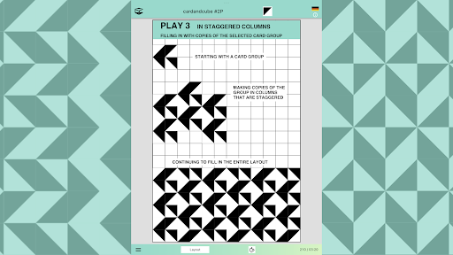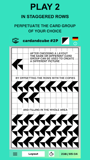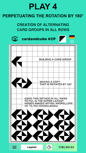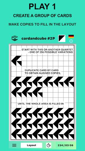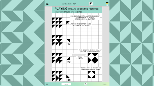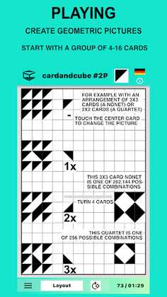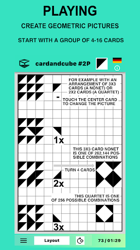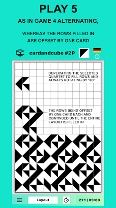 When opening the app an elegant virtual card introduces itself. Follow the suggestions learning how to play in layouts with up to 600 cards of the app (up to 864 with the desktop). To start tap the “Play now” button. This run-through can be called up again via the information menu "i". That is where you can find instructions too. After choosing a layout, start to fill free spaces with cards by simply touching or clicking them. Each card can be initially rotated a quarter of a turn and then repeatedly rotated in the plane of the layout until you find just the orientation you want.