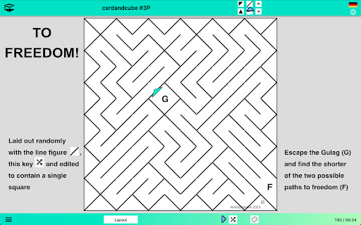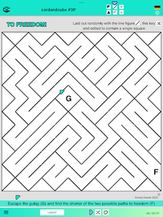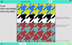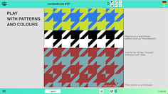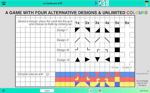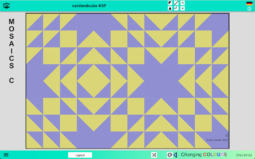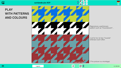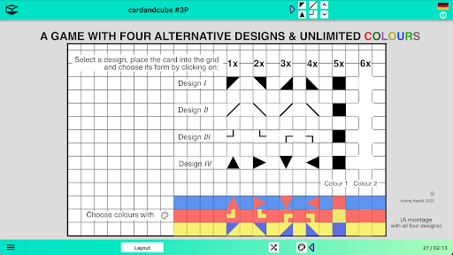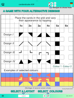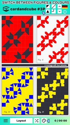 As compared to cardandcube #2, the present game offers a practically unlimited choice of colour pairs for the chosen figure and the background. Furthermore, in cardandcube #3 there is a choice to use monochrome cards instead of figures. On the other side, cardandcube #2 presents an unique option to alter the complete picture on the display by rotating all cards around their axes by 90° at once. Thus, it takes three clicks to make four pictures out of one.