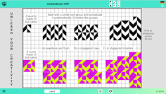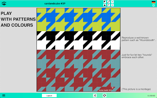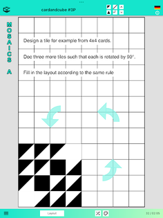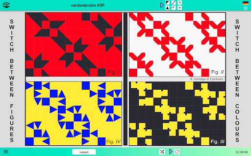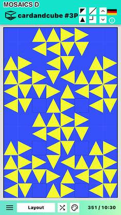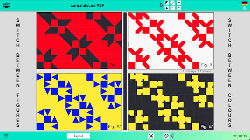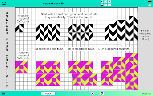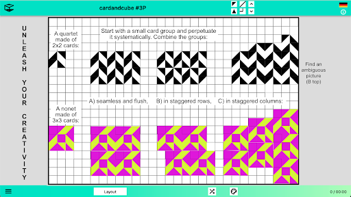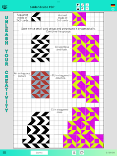 Using three of the four figures 1,296 different geometric patterns can be created from 4 cards in the 2x2 format (card quartets) each. With various strategies for merging such or larger groups of cards, an almost unlimited number of images can be created. Like in tessellation, the card groups can be placed next to each other flushed, offset or rotated. There are 15 playing areas available ranging from 2x2 to 20x30 cards.