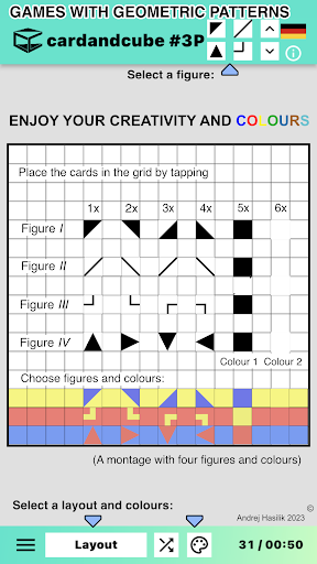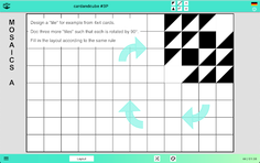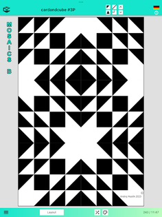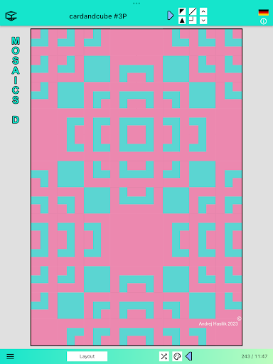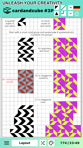 Creating decorative geometric images according to your own imagination is ideal for creative relaxation in your free time or while waiting. You may also be inspired by geometric patterns from the Middle Ages and antiquity. After filling the playing area enjoy changing your creations by switching between the card designs, or by introducing random or systematic changes in the card orientation in selected positions. Make unique irregularities or play to create symmetry and order.