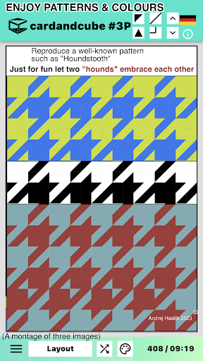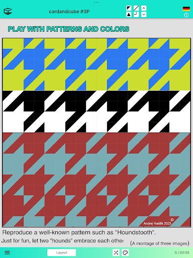 COPIES of the patterns can be saved to a clipboard or your device's memory, exported as images (filename.png) and stored or shared (filename.card3), or printed. The shared images can then be edited by fellow players according to preagreed rules, whereby the number of moves and the time it takes to solve a graphic task can be recorded and compared among a group of players.