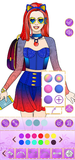 Design outfits like a fashionista: dress up, choose hairstyle, necklaces and other amazing accessories such as skirts and dresses. Select a color and click on the fragment you want to color, when the painting of college girl is created, start drawing and coloring, become BFF fashion clothes designer.