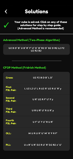1. Advanced method (Kociemba's two-phase method) - Solves any scramble in average 21 moves. This solving method is recommended for most of the users.