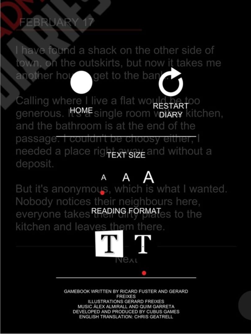 Deadman Diaries follows John Riggs' personal diary, an unfortunate bank employee who finds himself indebted to gambling and dragged down a shady path of violence and lethal situations. Players get to play the protagonist's fate, making different choices and determining whether he survives or succumbs to the unknown.