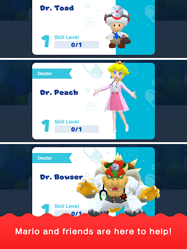Mario and his team have joined the medical field to fight against the various virus types. More than 30 characters, including Bowser, Peach, and Luigi, have become doctors and assistants, with different viral-busting abilities to help them in their journey. Players can experiment with different combinations to find the best match to fit their gameplay and strategy.
