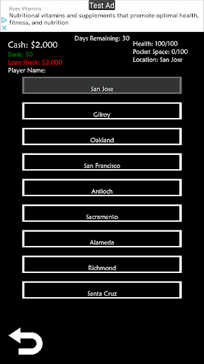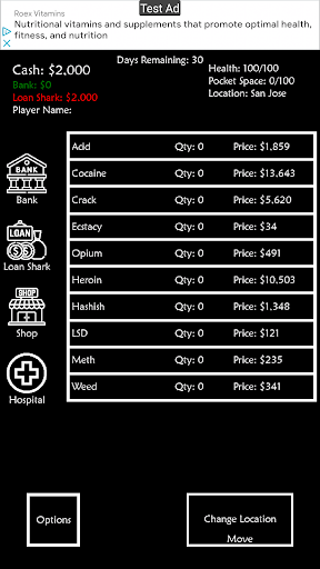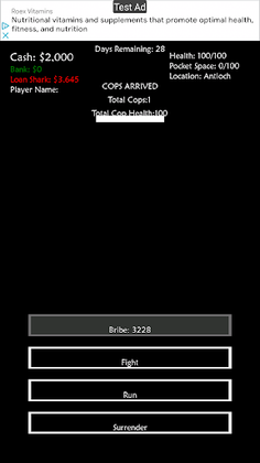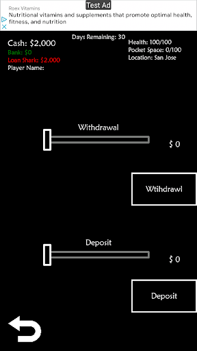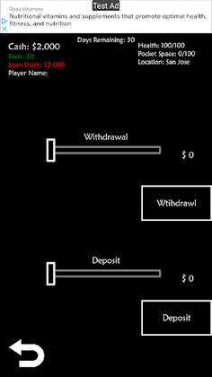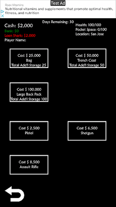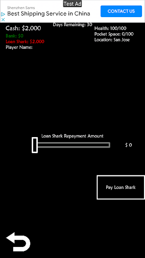 This is a quick game to kill time when needed. The goal of the game is to make the most money in the number of days you have. You start out borrowing money from a local Loan Shark and as each day passes that you do not pay your balance will increase.