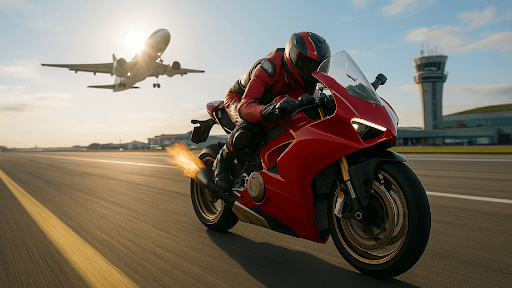 Choose your motorbike and hit the road. Explore vast environments including the city and airport, each filled with ramps, obstacles, and challenges. Master your riding and driving skills as you race against time or perform tricks through dense traffic.