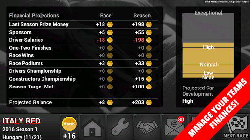 * Manage your accounts, upgrade your car, invest in Research and Development