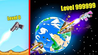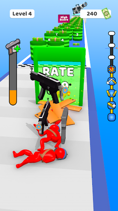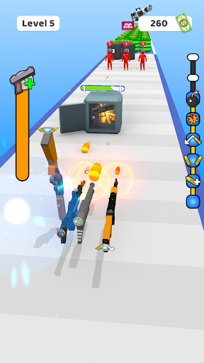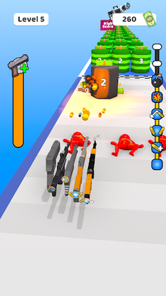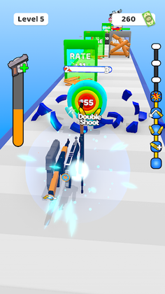 Break and collect the circles, add as many guns as you collect parts and start discovering new weapons.