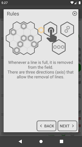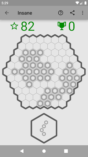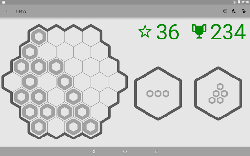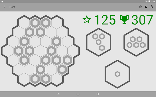 The primary goal of Hex Puzzle is to accumulate as many points as possible. Points are earned by placing pieces on the board, with bigger pieces giving you more points. When you fill a line (in any of the three possible directions), it gets removed from the field. The more lines you remove at once, the more points you score. After placing all pieces, new pieces are generated. The game ends when no more options remain for placing the current pieces.