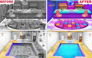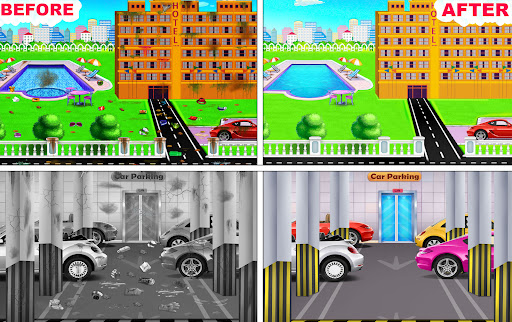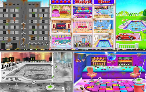 Big Hotel Room Cleaning Features:This is a excellent collection of cleanup games with plenty of public places levels like Reception, Guests room, Swimming pool, Bathroom, Bedroom , hotel, Hall room, Kitchen which include many principal things to teach girls how to make their home and city neat & clean.