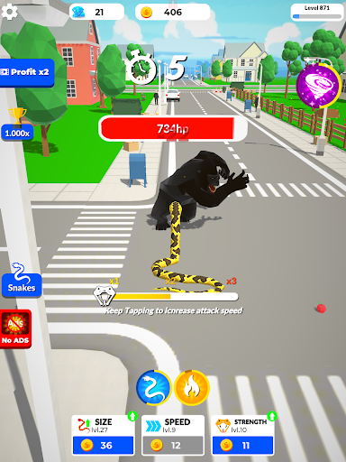 Declare war on this city! Create mega rampage, havoc, and chaos! Turn on Sharknado mode to destroy anything that gets in your way. Grow until you become a snake tornado that eats up asphalt, buildings, and cars unlucky enough to be in its path! Watch humans fly online, see trees get pulled out of the ground, and houses blown to bits and pieces! Now that you’re a strong and huge reptile, take full control of this brutal power! Tap and crush them all!
