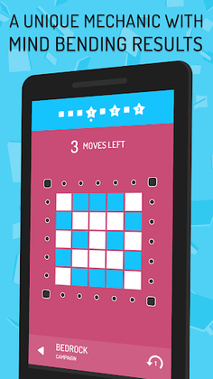 In the game, you press buttons situated on a tile grid to flip a particular pattern of tiles aiming to transform all tiles into the same color using minimum moves possible. It may be easy to solve, but solving it well is hard. Invert offers three gaming modes: Campaign, Challenge, and Expert. In Campaign Mode, you have to finish a level within limited moves, but there's no time limit. Challenge Mode demands you to solve levels against the clock and use any number of moves. Expert Mode is similar to Challenge Mode, but significantly harder, requiring you to become an experienced player.