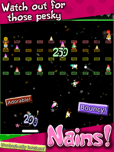 Get ready to experience the excitement of breaking bricks once again in the all-new Jardinains! This beloved classic brick-breaking game boasts countless unique and thrilling levels that will take players on a rollicking journey. You'll have to break bricks, avoid flowerpots, and keep mischievous 'nains from ruining your day! Jardinains! is an innovative take on the classic brick-breaker genre where you'll need to use your paddle and ball to break bricks and earn points. You'll also collect useful powerups by bouncing and breaking 'nains. These cute little gnomes are nestled among the bricks, and they won't be too happy with your efforts to clear them out. They'll do everything they can to stop you, including throwing flowerpots, anchors, baseballs, smartphones, fancy cakes, and anything else they can get their hands on. You'll need to use the ball to knock off 'nains off their bricks and then bounce them with the paddle to get extra points and power-ups.