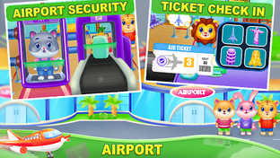 Play an airport role play game by doing job of cashier, steward, pilot, cashiers and security officers.