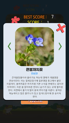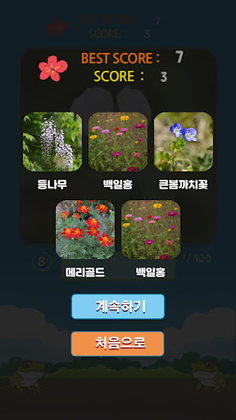 Repeat your learning process to memorize the plant names and expand your knowledge of flowers. Furthermore, if you solve the question without getting wrong, the speed of the test will gradually increase, helping you develop your quickness. The game is developed by Park Seung-Chun, who has written about plants, including "Korean Primrose" and "Comparison of 100 and 700 Kinds of Korean Trees." If you want to keep up with Park Seung-Chun, you can contact him through his email, Facebook, or blog.