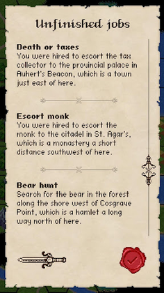 Broadly roguelike retro role playing game with exploration, quests, turn based combat and permadeath set in a low fantasy world.