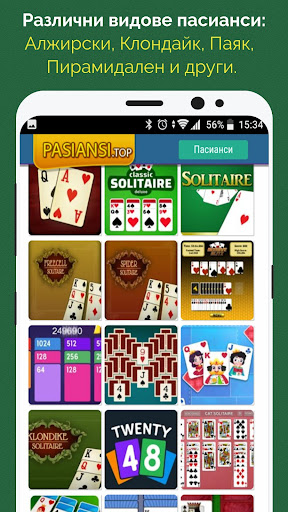 Паяк пасианс, Алжирски, Клондайк пасианс, Скорпион , Фрийсел пасианс, Голф пасианс, Пирамидален и други.