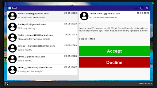 Create, diagnose, repair and customize your own pc. take client requests of creating pc and show them your ultimate talent of pc building in PC building Simulation. you can stress test and benchmark processor (CPU), graphics card (GPU) and Storage of the build.