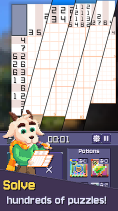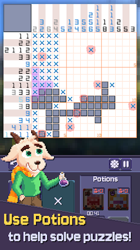 Potions come in a range of types with varying effects, from solving parts of the puzzle, highlighting solvable rows/columns or slowing/stopping time.
