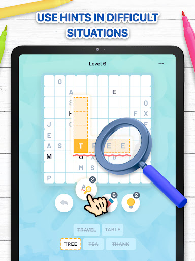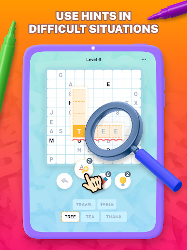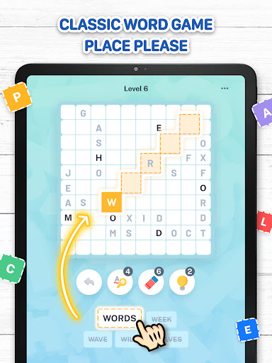 The hints will help you have more fun:⚡ Use the eraser if you need to erase a word from the board.