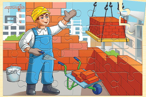 Playing this kids puzzle game your child will see that there are special tools used by all workers and some special uniforms in each profession, so your kid will learn them.
