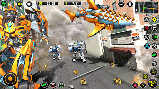 Perform massive destructive rescue mission of operating robot shooting or robot fighting in robot battle games. Show the grand robot power as a warrior in the city battle of shark robot games. Execute strategic action of shark attack to fight against evil forces in robot war games. Incredible shark simulator games will give you the thrilling game play of transforming robots in open world modern city. Shark robot transforming animation in futuristic transform robots battle of transforming shark games make the game play more realistic.