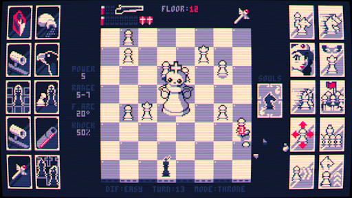 In this unique tactical challenge, each turn grants you the choice to either maneuver your king or fire at the opposing pieces. But beware, after discharging your shotgun, you must move again to reload, balancing offense with movement strategy. Dodge checkmate while targeting the enemy king – your goal is to clear each level by eliminating their ruler. Upon conquering a floor, you’ll be presented with two random pairs of upgrades, each combining buffs for yourself and enhancements for your adversaries. Deciding carefully which path to take is crucial for progressing through increasingly difficult floors and reclaiming your lost realm.