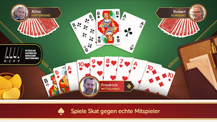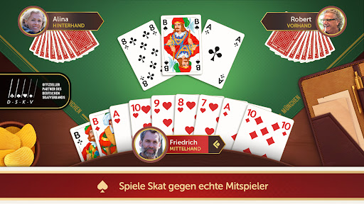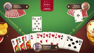 Play traditional German card game Skat, compete globally with LIVE PLAYERS, fair AI distribution, leagues & user-friendly interface. Perfect for fans of Rummy, Doppelkopf.