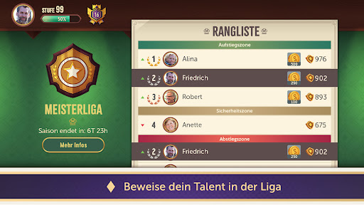 The game offers a variety of stunning features, such as live gameplay with real players, fair gameplay guaranteed through AI that distributes the card according to the normal distribution, three different card designs, and a choice of the tournament or casual rules. Both variants carry their charm, so give them a try. You can flaunt your skills in the league to rise up the ranks and become a champion. Our intuitive app, various help sites, and great customer support will facilitate your journey to master the game.