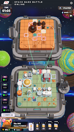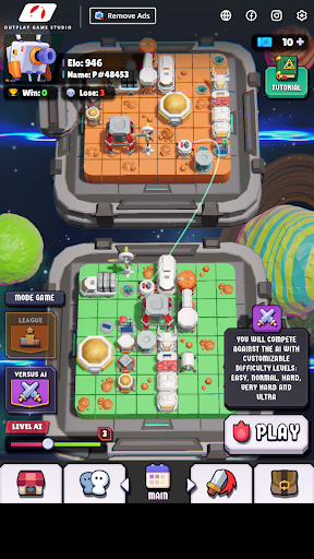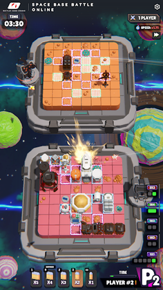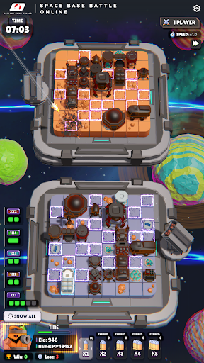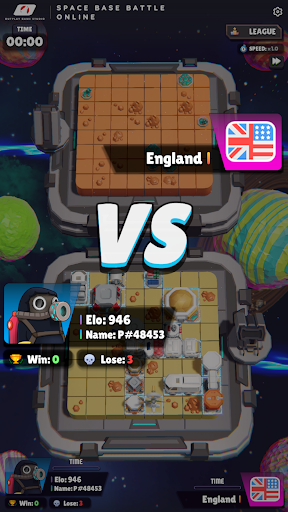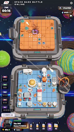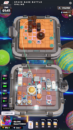 Space Base Battle Online is a unique, intelligent, turn-based 3D strategy board game that's easy to access online. To win this game, your mission is to destroy all of the enemy's space bases. However, the enemy's space bases will be completely hidden, and you need to destroy them strategically according to the following principles. The enemy's and our bases are identical in shape, size, and orientation. However, they are positioned differently on an 8x8 chessboard. In each turn, you will launch a missile at your opponent's square on the chessboard. If the square contains part of a space base, it will turn green and you can continue shooting. Conversely, if the square is empty, it will turn purple and you lose your turn. If you launch a missile at two or more targets during your turn, you can continue shooting if only one target is hit. If the tiles you hit form the shape of a space base, they will be revealed. From there, you can deduce the remaining space base targets and strategically plan your shots. When all of the enemy's space bases are revealed, you are the winner. Each turn only lasts 20 seconds, so calculate quickly and wisely. If time runs out and you haven't decided to shoot, don't worry, your missile will randomly launch into an opponent's square. You can play online with strangers and offline with your computer. Good luck and have fun!