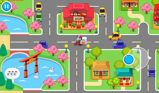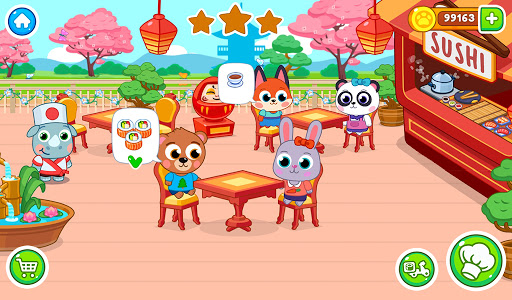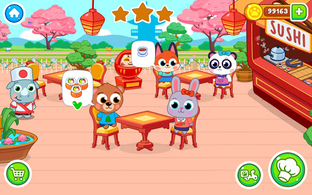 Well, let's get started! Today you our restaurant is full of visitors. Quickly accompany them to banquet hall, suggest them to take seats and start gathering orders. Then hurry up to the kitchen and start cooking. Do you want to learn how to make rolls? It's very easy! Just place a sheet of nori and cover it with a thin layer of rice. Then add shrimps, fish and other ingredients in a line on top of the rice in the centre. Roll it all up and cut it in equal pieces. Put them carefully on a plate. Add some wasabi and ginger. That's it! Meal is ready! Now you can serve it. Offer to your guests tasty and aromatic tea. Full and satisfied clients will reward you with coins. Further you can use them to upgrade your place. Also some one can order delivery, to houses. In the streets of a small but beautiful town.
