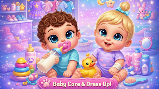 Triplet Chic Baby Care Nursery game for Kids is virtual daily routine activities fun like diaper change, newborn spa and bath time, twins playing toys and eating, babies sleep and bedtime stories, dress up and toddlers medical checkup.