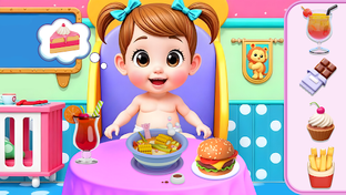 Pour Cat Food with Kids rocking horse pony toys. Manage baby seats and stroller, put baby bibs, prepare milk bottles and then pizza, burger, chicken barbQ, noodles and cereals with mango, formula, strawberry or apple juices and at the end Ice cream flavours as desserts.