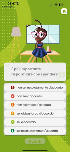 Answer easy and fun questions according to your age group and each time choose the answer that better represents you. Once you are finished, Mica the Ant will be able to tell you how you manage your money and what kind of relationship you have with it! Finding out what type of saver you are, will make you more aware of your finances and improve the way you manage them!