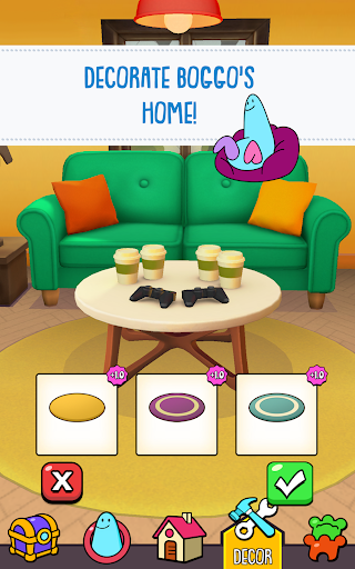• Enjoy daily bonuses that grant extra currency for sprucing up Boggo’s living space.