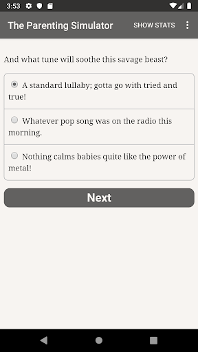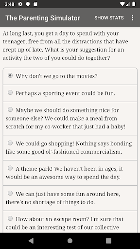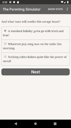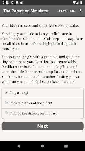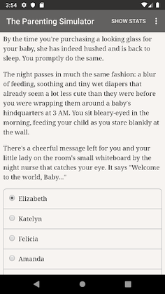 The Parenting Simulator is a lighthearted 189,000 word interactive slice-of-life novel by Matt Simpson, where your choices control the story. It's entirely text-based—without graphics or sound effects—and fueled by the vast, unstoppable power of your imagination.