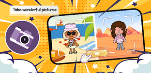 • Various ways to play, including theme backgrounds, dress up, and picture-taking
