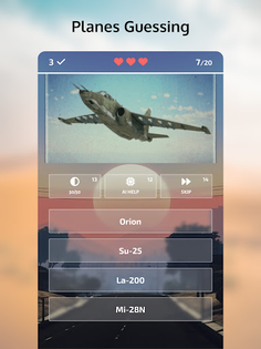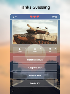 Guess planes, tanks, helicopters, and ships from the popular game War Thunder in five unique modes: Daily Challenge, Classic, Hardcore, Time Attack, and Training. Use three types of hints, including 50/50, AI Help, and Skip Question, to help you along the way. Earn coins and gems to buy hints and other items in the in-game store, which also features a lucky spin wheel, leaderboards, achievements, and player statistics.