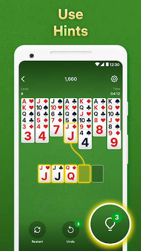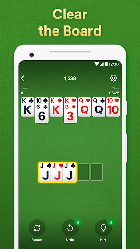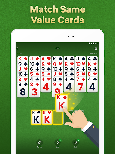 • Any 3 solitaire cards of the same face value can be matched and cleared from the board. To do so, tap and send the matching cards to the foundation.