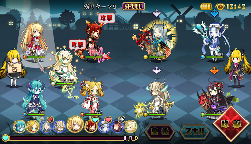 簡単な操作である「攻撃ボタン」と「スキルボタン」だけでコマンドバトルを展開します。ターンは味方と敵で分けられず、キャラクターの行動力に依存します。スキルによっては敵の行動順を妨害することもできるので、戦い方を慎重に考えましょう。何度かひどくやられたとしても、数ターンの待ち時間で復活できるのでご安心ください。また、特別なスキル「奥義」があります。強力な技ですが、1度しか使えないため、使用するタイミングを見定める必要があります。オートボタンを押すことで、簡単に進行を進めることができますので、操作に疲れたり退屈したりした場合はご活用ください。