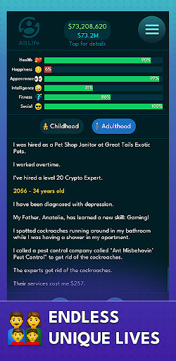 Navigate an intuitive and simple-to-understand UI as you experience a different life with each tap of the 'Age' button. Our game's core mechanics revolve around straightforward pop-ups and unique random events, making it easy for you to grow older year by year and shape your personalized life sim story.