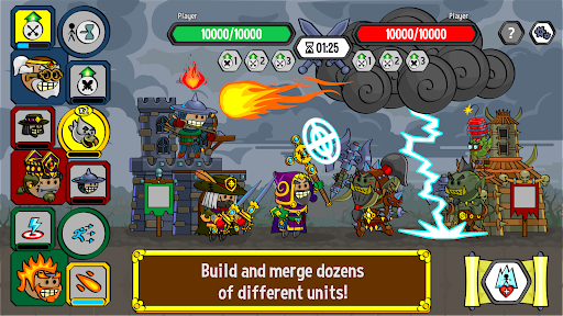 - Merge-mechanics allows you to create unique combat units and spells