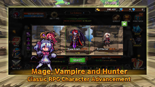 The graphics are in retro rpg style, where all the art is in pixel style. In this idle rpg game you are given to choose one of three heroes: Mage, Vampire and Hunter, but you can play and pump each one. There are many entities to pump in this idle prg: heroes, magic, armor, gems, forge, etc.