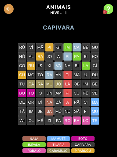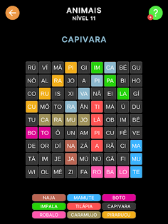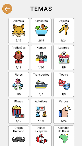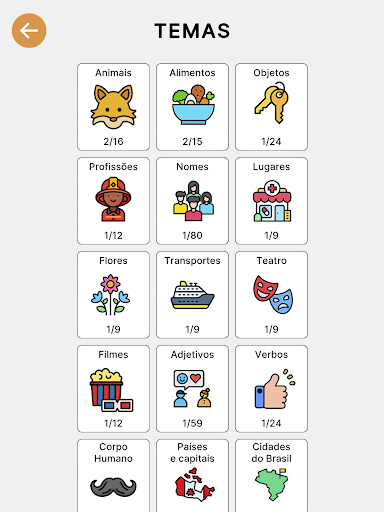 THEMES: Choose between themes: Animals, Food, Objects, Professions, Names, Places, Flowers, Transport, Theater, Films, Adjectives, Verbs, Human body, Countries and capitals and Cities in Brazil;